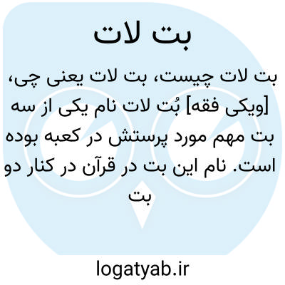 [ویکی فقه] بُت لات نام یکی از سه بت مهم مورد پرستش در کعبه بوده است. نام این بت در قرآن در کنار دو بت دیگر به نام های عزی و منات ذکر شده که از نظر اعراب جاهلی «دختران خدا» به شمار می رفته اند.