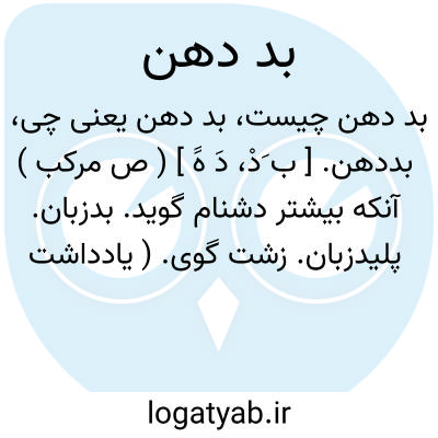 بددهن. [ ب َدْ، دَ هََ ] ( ص مرکب ) آنکه بیشتر دشنام گوید. بدزبان. پلیدزبان. زشت گوی. ( یادداشت مؤلف ). فحش دهنده. ناسزاگوینده. ( فرهنگ فارسی معین ).