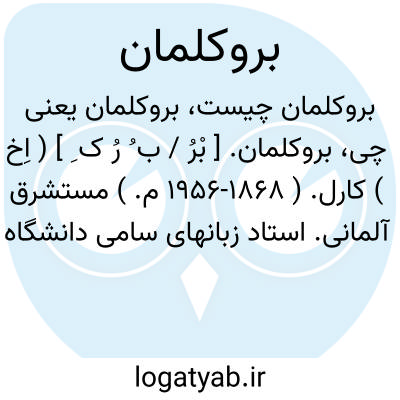 بروکلمان. [ بْرُ / ب ُ رُ ک ِ ] ( اِخ ) کارل. ( 1868-1956 م. ) مستشرق آلمانی. استاد زبانهای سامی دانشگاه برسلاو و استاد شرقیات دانشگاه هاله. وی از بزرگترین سامی شناسان عصر خود بود و بر زبان و ادبیات عربی تسلط داشت. از تألیفات بزرگ اوست: لغتنامه سریانی ( 1893 م. )، دستور تطبیقی زبانهای سامی ( 1898-1902 م. )، نحو عبری ( 1956 م. ). نیز عیون الاخبار ابن قتیبه را تصحیح و منتشر کرد. تاریخ ملل و دول اسلامی او مشهور است. ( دایرة المعارف فارسی ). و رجوع به تاریخ ادبیات ایران، ادوارد براون ص 45 و 290 شود.