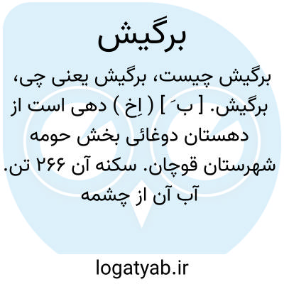 برگیش. [ ب َ ] ( اِخ ) دهی است از دهستان دوغائی بخش حومه شهرستان قوچان. سکنه آن 266 تن. آب آن از چشمه ومحصول آن غلات است. ( از فرهنگجغرافیایی ایران ج 9 ).