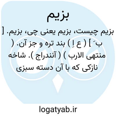 بزیم. [ ب َ ] ( ع اِ ) بند تره و جز آن. ( منتهی الارب ) ( آنندراج ). شاخه نازکی که با آن دسته سبزی را می بندند. ( ناظم الاطباء ). || فضله زاد. ( منتهی الارب ) ( آنندراج ). مازاد توشه. ( یادداشت بخط دهخدا ). || شوربای باقی در تک دیگ بی گوشت. ( منتهی الارب ) ( آنندراج ). باقی مانده در تک دیگ از شوربا و جزآن. ( ناظم الاطباء ). || دسته تره. ( مهذب الاسماء نسخه خطی ). دسته سبزی. ( ناظم الاطباء ). || اول بار خرما. طلع. ( یادداشت بخط دهخدا ).