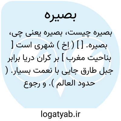 بصیره. [ ] ( اِخ ) شهری است [ بناحیت مغرب ] بر کران دریا برابر جبل طارق جایی با نعمت بسیار. ( حدود العالم ). و رجوع به قاموس الاعلام ترکی و لغات تاریخیه و جغرافیه ترکی شود.