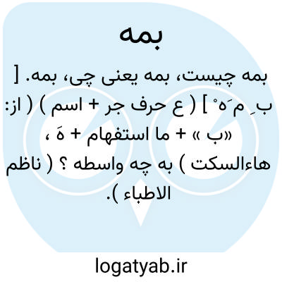 بمه. [ ب ِ م َه ْ ] ( ع حرف جر + اسم ) ( از: «ب » + ما استفهام + هَ، هاءالسکت ) به چه واسطه ؟ ( ناظم الاطباء ).