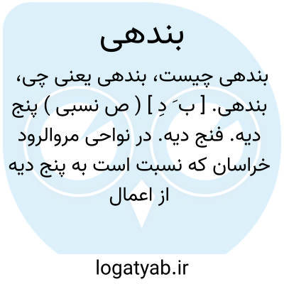 بندهی. [ ب َ دِ ] ( ص نسبی ) پنج دیه. فنج دیه. در نواحی مروالرود خراسان که نسبت است به پنج دیه از اعمال مروالرود خراسان. ( یادداشت بخط مؤلف ).