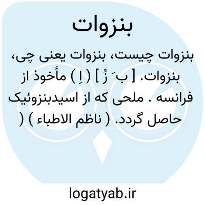 بنزوات. [ ب َ زُ ] ( اِ ) مأخوذ از فرانسه. ملحی که از اسیدبنزوئیک حاصل گردد. ( ناظم الاطباء ) ( از فرهنگ فارسی معین ). بنزوآت دو سدیم 144/04 = C6H5CooNAافیسینال گرد سفید انیدر ( خشک ) است. محلول یک در ده آن خنثی و یا در مقابل تورنسل کمی قلیایی میباشد. در 1/8 قسمت آب 20 زینه و 1/4 قسمت آب جوشان و 49 قسمت الکل 90 زینه و 3/5 قسمت گلیسیرین محلول است. ( کارآموزی داروسازی ص 143 ).