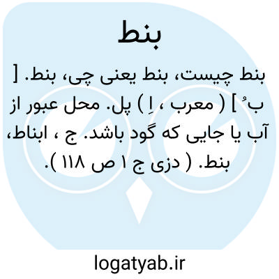 بنط. [ ب ُ ] ( معرب، اِ ) پل. محل عبور از آب یا جایی که گود باشد. ج، ابناط، بنط. ( دزی ج 1 ص 118 ).