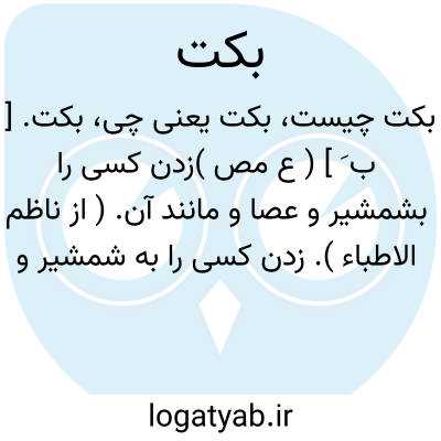 بکت. [ ب ُ ک َ ] ( اِخ ) دهی از دهستان حومه بخش سروستان شهرستان شیراز. سکنه آن 354 تن. آب از قنات و چاه. محصول آنجا غلات، تنباکو، صیفی. شغل اهالی آن زراعت و قالی بافی است. ( از فرهنگ جغرافیایی ایران ج 7 ).