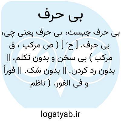 بی حرف. [ ح َ ] ( ص مرکب، ق مرکب ) بی سخن و بدون تکلم. || بدون رد کردن. || بدون شک. || فوراً و فی الفور. ( ناظم الاطباء ).