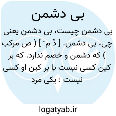 بی دشمن. [ دُ م َ ] ( ص مرکب ) که دشمن و خصم ندارد. که بر کین کسی نیست یا بر کین او کسی نیست: