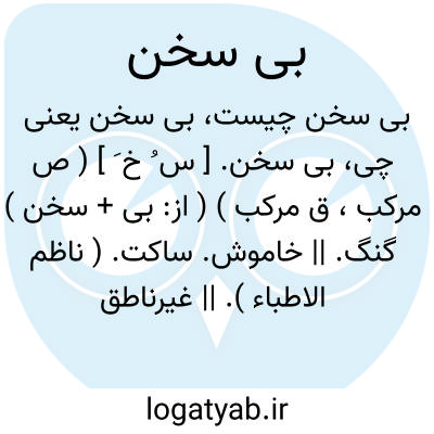 بی سخن. [ س ُ خ َ ] ( ص مرکب، ق مرکب ) ( از: بی + سخن ) گنگ. || خاموش. ساکت. ( ناظم الاطباء ). || غیرناطق: