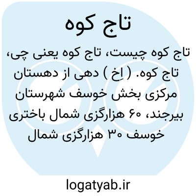 تاج کوه. ( اِخ ) ده کوچکی است از دهستان زیر کوه بخش قاین شهرستان بیرجند 118 هزارگزی جنوب خاوری قاین، کوهستانی سردسیر با 16 تن سکنه. ( فرهنگ جغرافیائی ایران ج 9 ).