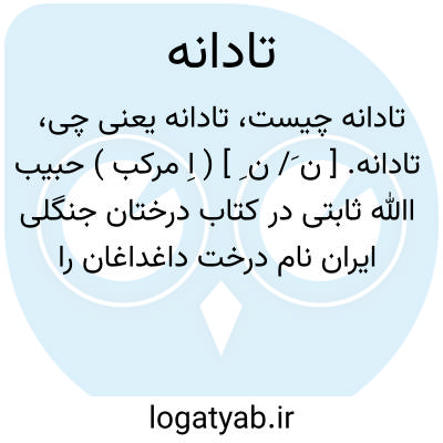تادانه. [ ن َ/ ن ِ ] ( اِ مرکب ) حبیب اﷲ ثابتی در کتاب درختان جنگلی ایران نام درخت داغداغان را در لاهیجان تادانه ضبط کرده است ولی غالباً این درخت را در لاهیجان و اطراف بنام «تو» خوانند. به لغت دیلم حب الزلم است. ( تحفه حکیم مؤمن ) ( فهرست مخزن الادویه ). تا. داغداغان. توغدان. این اسامی در جنگلهای شمالی ایران بدون تشخیص و فرق به سه قسم درخت خانواده سلتیس داده میشود.