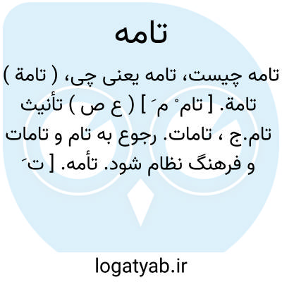 ( تامة ) تامة. [ تام ْ م َ ] ( ع ص ) تأنیث تام.ج، تامات. رجوع به تام و تامات و فرهنگ نظام شود.