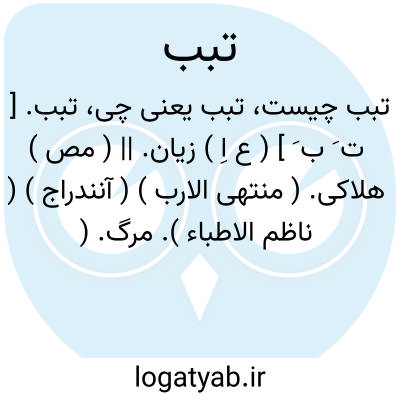 تبب. [ ت َ ب َ ] ( ع اِ ) زیان. || ( مص ) هلاکی. ( منتهی الارب ) ( آنندراج ) ( ناظم الاطباء ). مرگ. ( ناظم الاطباء ). تباب و تبیب مثله. ( منتهی الارب ) ( آنندراج ). تب. ( منتهی الارب ).