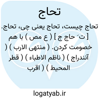 تحاج. [ ت َ حاج ج ] ( ع مص ) با هم خصومت کردن. ( منتهی الارب ) ( آنندراج ) ( ناظم الاطباء ) ( قطر المحیط ) ( اقرب الموارد ). || حجت آوردن و حجت گرفتن. ( آنندراج ). با یکدیگر حجت آوردن. ( ترجمان جرجانی ترتیب عادل بن علی ).