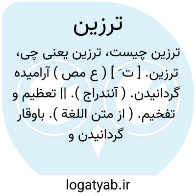 ترزین. [ ت َ ] ( ع مص ) آرامیده گردانیدن. ( آنندراج ). || تعظیم و تفخیم. ( از متن اللغة ). باوقار گردانیدن و محجوب نمودن و قابل احترام کردن. ( ناظم الاطباء ).