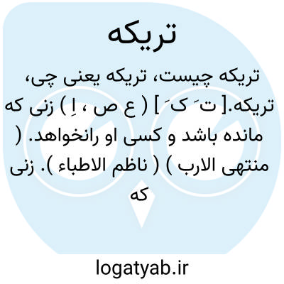 تریکه.[ ت َ ک َ ] ( ع ص، اِ ) زنی که مانده باشد و کسی او رانخواهد. ( منتهی الارب ) ( ناظم الاطباء ). زنی که فروگذاشته شود و هیچکس با او زناشویی نکند. ( از اقرب الموارد ) ( از المنجد ). زنی که شوهر نکند. ( آنندراج ). || مرغزاری که ناچریده مانده باشد. ( منتهی الارب ) ( آنندراج ) ( ناظم الاطباء ) ( از اقرب الموارد ). || آبی که از سیل باقیمانده. ( منتهی الارب ) ( آنندراج ) ( ناظم الاطباء ). || بیضه ای که بچه از آن برآمده یا بیضه شترمرغ که گذاشته باشد. ( منتهی الارب ) ( از ناظم الاطباء ). بیضه متروک شتر مرغ، بیضه ای که جوجه از آن خارج شده باشد. ( از المنجد ). بیضه ای که جوجه از آن خارج شده باشد و بقولی بیضه شترمرغ بخصوص. ( از اقرب الموارد ). || خود آهنین.( منتهی الارب ) ( آنندراج ) ( ناظم الاطباء ) ( از اقرب الموارد ). خود آهنینی که در جنگها بر سر نهند. ( از المنجد ): اقتحم فی المعرکة و علی رأسه تریکة. ( اقرب الموارد ). ج، ترائک و تریک. ( منتهی الارب ) ( آنندراج ) ( ناظم الاطباء ). و رجوع به تریک و ترائک شود.