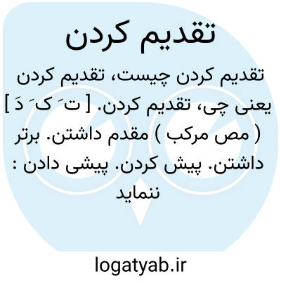 در دل خویش بر آن همت مردان تقدیم.ابوحنیفه ( از تاریخ بیهقی ).محمدبن یوسف البخاری ازجمله اصحاب امام هشتم و شافعی بود رحمه اﷲ و با علم و زهد بود و او را بر علمای بخارا تقدیم کردندی و او را بسیار بیازمودند. ( تاریخ بخارا ص 4 ). || بجای آوردن انجام دادن: و تأدیب این بی خویشتنی در باب تو تقدیم کنم. ( سندبادنامه ص 125 ). || اهداء کردن. پیش کش کردن. برایگان دادن چیزی را به کسی پیش آوردن پیش داشتن: