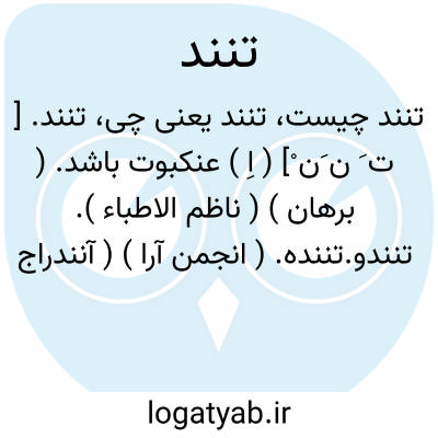 تنند. [ ت َ ن َن ْ] ( اِ ) عنکبوت باشد. ( برهان ) ( ناظم الاطباء ). تنندو.تننده. ( انجمن آرا ) ( آنندراج ) ( فرهنگ رشیدی ). تندو.( فرهنگ جهانگیری ) ( فرهنگ رشیدی ). هر سه بمعنی عنکبوت و جولاه باشد. ( آنندراج ) ( انجمن آرا ). هر چهار بمعنی عنکبوت. ( فرهنگ رشیدی ). دیوپای. غنده. ( یادداشت بخط مرحوم دهخدا ). رجوع به این کلمات و تنندو شود. || ( ص ) مردم کاهل و تنبل را نیز گویند. ( برهان ) ( آنندراج ) ( ناظم الاطباء ). کاهل. ( فرهنگ رشیدی ).