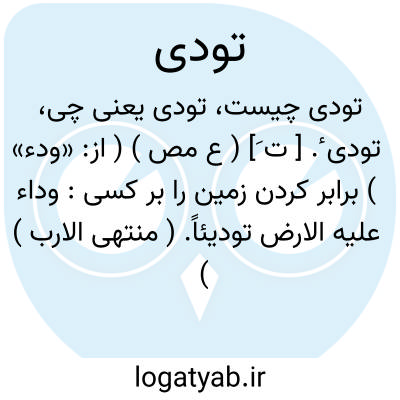 تودی ٔ. [ ت َ] ( ع مص ) ( از: «ودء» ) برابر کردن زمین را بر کسی: وداء علیه الارض تودیئاً. ( منتهی الارب ) ( ناظم الاطباء ) ( از اقرب الموارد ). تودئة. ( ناظم الاطباء ) ( اقرب الموارد ). || هلاک کردن قوم را: وداء فلان بالقوم. ( منتهی الارب ) ( ناظم الاطباء ) ( از اقرب الموارد ).