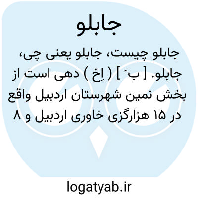 جابلو. [ ب َ ] ( اِخ ) دهی است از بخش نمین شهرستان اردبیل واقع در 15 هزارگزی خاوری اردبیل و 8 هزارگزی شوسه ٔاردبیل به آستارا. در جلگه قرار دارد و هوای آن معتدل است. دارای 418 تن سکنه و آب آن از چشمه و چاه و محصول آن غلات و حبوبات و شغل اهالی زراعت و گله داری و قالی بافی است. ( فرهنگ جغرافیایی ایران ج 4 ص 142 ).