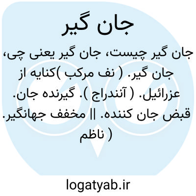 جان گیر. ( نف مرکب )کنایه از عزرائیل. ( آنندراج ). گیرنده جان. قبض جان کننده. || مخفف جهانگیر. ( ناظم الاطباء ).