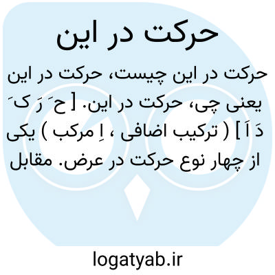 حرکت در این. [ ح َ رَ ک َ دَ اَ ] ( ترکیب اضافی، اِ مرکب ) یکی از چهار نوع حرکت در عرض. مقابل حرکت در کم و کیف و وضع. حرکت در مکان. جابجا شدن.