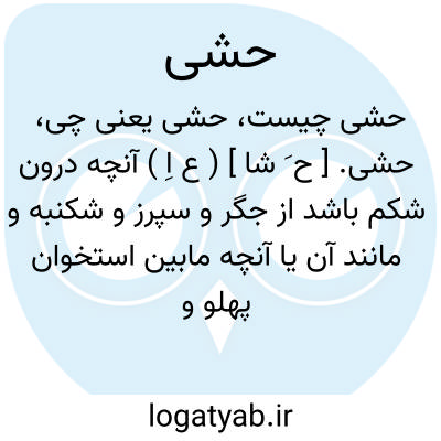 حشی. [ ح َ شا ] ( ع اِ ) آنچه درون شکم باشد از جگر و سپرز و شکنبه و مانند آن یا آنچه مابین استخوان پهلو و سرین است یا مابین ظاهر شکم و کنار و میان مردم ج، احشاء. || تاسه، دمه. || کرانه. کنار. ناحیة: انا فی حشاه.