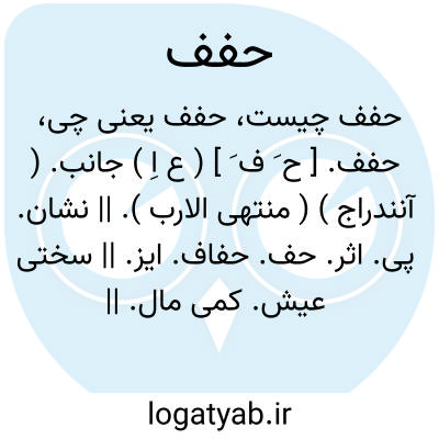 حفف. [ ح َ ف َ ] ( ع اِ ) جانب. ( آنندراج ) ( منتهی الارب ). || نشان. پی. اثر. حف. حفاف. ایز. || سختی عیش. کمی مال. || ناحیت. || قصیر مقتدر از مردان. کوتاه باقدرت. ( منتهی الارب ).