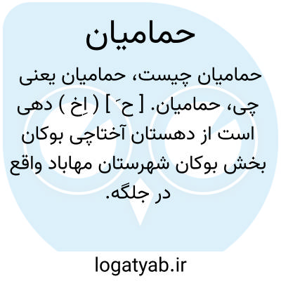 حمامیان. [ ح َ ] ( اِخ ) دهی است از دهستان آختاچی بوکان بخش بوکان شهرستان مهاباد واقع در جلگه. معتدل مالاریائی است و دارای 720 تن سکنه میباشد.از سیمین رود مشروب میشود. محصولاتش غلات، توتون، چغندر و حبوب. اهالی به کشاورزی و گله داری گذران میکنند.راه آن شوسه است. ( از فرهنگ جغرافیائی ایران ج 4 ).