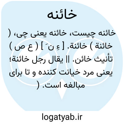 ( خائنة ) خائنة. [ ءِ ن َ ] ( ع ص ) تأنیث خائن. || یقال رجل خائنة؛ یعنی مرد خیانت کننده و تا برای مبالغه است. ( منتهی الارب ). || ( اِمص ) خیانت: و لاتزال تطلع علی خائنة منهم. ( قرآن 13/5 )؛ و همیشه آگاه شوی بر خیانت ایشان.