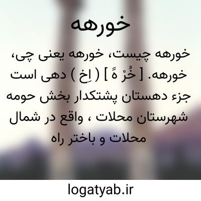 خورهه. [خُرْ هََ ] ( اِخ ) دهی است از دهستان بربرود بخش الیگودرز شهرستان بروجرد، کنار راه مالرو میشله به الیگودرز. این دهکده در جلگه قرار دارد با آب و هوای معتدل و 457 تن سکنه. آب آن از قنات و محصول آن غلات و لبنیات و تریاک و چغندر و حبوبات. شغل اهالی زراعت و گله داری و از صنایع دستی زنان قالی و جاجیم بافی. راه اتومبیل رو است. ( از فرهنگ جغرافیایی ایران ج 6 ).