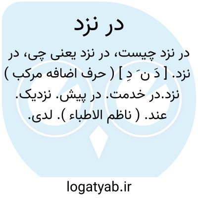 در نزد. [ دَ ن َ دِ ] ( حرف اضافه مرکب ) نزد.در خدمت. در پیش. نزدیک. عند. ( ناظم الاطباء ). لدی.