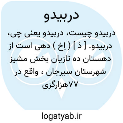 دربیدو. [ دَ ] ( اِخ ) دهی است از دهستان ده تازیان بخش مشیز شهرستان سیرجان، واقع در 77هزارگزی جنوب خاوری مشیز و دوهزارگزی خاور چهارطاق، با 100 تن سکنه. آب آن از قنات و راه آن مالرو است. ( از فرهنگ جغرافیایی ایران ج 8 ).