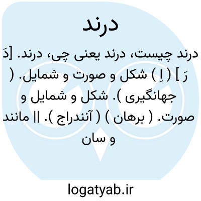 درند. [دَ رَ ] ( اِ ) شکل و صورت و شمایل. ( جهانگیری ). شکل و شمایل و صورت. ( برهان ) ( آنندراج ). || مانند و سان، چنانکه گویند: فلک درند؛ یعنی فلک سان و فلک مانند. ( برهان ) ( آنندراج ). مثل و مانند و سان و مشابهت. || رسم و طرز و روش. ( ناظم الاطباء ).