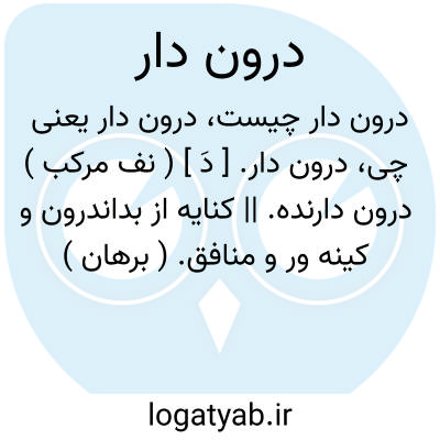 درون دار. [ دَ ] ( نف مرکب ) درون دارنده. || کنایه از بداندرون و کینه ور و منافق. ( برهان ) ( آنندراج ). تودار که مردمان کینه ورز و منافق باشند. ( لغت محلی شوشتر نسخه خطی ). اندرون دار. تودار: