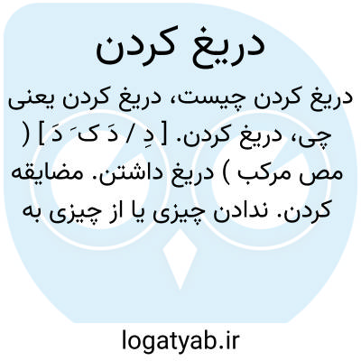 دریغ کردن. [ دِ / دَ ک َ دَ ] ( مص مرکب ) دریغ داشتن. مضایقه کردن. ندادن چیزی یا از چیزی به کسی. کوتاهی کردن. خویشتن داری کردن. امتناع و مخالفت کردن. منع کردن. ( یادداشت مرحوم دهخدا ). انکار کردن و رد کردن و امتناع نمودن و بازداشتن و ترک کردن و دور کردن. || زاریدن و ناله کردن و افسوس کردن. || رحم کردن. || حسرت داشتن. ( ناظم الاطباء ).