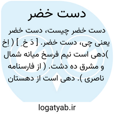 دست خضر. [ دَ خ ِ ] ( اِخ )دهی است نیم فرسخ میانه شمال و مشرق ده دشت. ( از فارسنامه ناصری ). دهی است از دهستان حومه بخش مرکزی شهرستان شیراز. واقع در 12هزارگزی جنوب خاوری شیراز و کنار راه فرعی شیراز به گشنکان. با 190 تن سکنه. آب آن از قنات است. ( از فرهنگ جغرافیائی ایران ج 7 ).