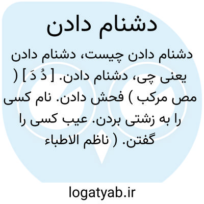 دشنام دادن. [ دُ دَ ] ( مص مرکب ) فحش دادن. نام کسی را به زشتی بردن. عیب کسی را گفتن. ( ناظم الاطباء ). ناسزا گفتن. استقذاف. ( دهار ). استیعاب. اسماع. ( تاج المصادر بیهقی ). اهتماط. بجوس. تسبیب. تشریز. تطلیة. تقاذف. تقصیب. تلقع. تمطیط. تهجیل. تهلیب. تهنید. جرح. جهار. ( منتهی الارب ). رصن. ( تاج المصادر بیهقی ). رمی. ( دهار ). سب.سبع. سحل. شتر. ( منتهی الارب ). شتم. ( دهار ). عذق. عضب. قد. قذع. ( منتهی الارب ). قذف. ( دهار ). قصب. قفو. لبخ. لحو. لسن. مجاهرة. مسافاة. مسافهة. مشاتمة. معاقمة. مقع. نحل. نخیط. هلب. ( منتهی الارب ):
