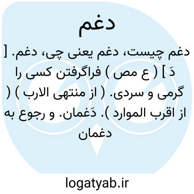 دغم. [ دَ ] ( ع مص ) فراگرفتن کسی را گرمی و سردی. ( از منتهی الارب ) ( از اقرب الموارد ). دَغمان. و رجوع به دغمان شود. || شکستن بینی کسی را و مایل کردن بسوی باطن. ( از منتهی الارب ) ( از اقرب الموارد ). || پوشیدن آوند را. ( از منتهی الارب ) ( از اقرب الموارد ).