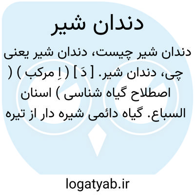 دندان شیر. [ دَ ] ( اِ مرکب ) ( اصطلاح گیاه شناسی ) اسنان السباع. گیاه دائمی شیره دار از تیره مرکبات با برگهای فراهم و گلهای زرد روشن بر روی ساقه بلند، برگهای نورسته آن خام و پخته خوراکی است. دانه هایش دارای رشته هایی است به شکل چتر که باد بآسانی آنها را می برد. قاصدک. ( از دایرةالمعارف فارسی ).
