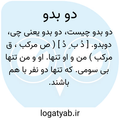 دوبدو. [ دُ ب ِ دُ ] ( ص مرکب، ق مرکب ) من و او تنها. او و من تنها بی سومی. که تنها دو نفر با هم باشند. خلوت دونفری. ( از یادداشت مؤلف ). مقابله از دو کس به نوعی که ثالثی درآن نباشد. ( آنندراج ). دو تا با هم بدون سیوم. ( ناظم الاطباء ): امیر مرا بخواند و خالی کرد دوبدو و گفت: این چه بود که ما کردیم. ( تاریخ بیهقی ).