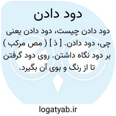 دود دادن. [ دَ ] ( مص مرکب ) بر دود نگاه داشتن. روی دود گرفتن تا از رنگ و بوی آن بگیرد. ادخان. تدخین. ( یادداشت مؤلف ). در معرض دود گذاشتن چیزی را چنانکه ماهی و جز آن برای خشکانیدن و غیره. ( از فرهنگ لغات عامیانه ). || ریختن دارویی بر آتش و عضوی از بدن چون چشم و بینی و چهره را بر آن داشتن. ریش و جراحت اندامی را به دود دارویی داشتن. نزدیک کردن دود دارویی به عضوی از بدن و آن بخور خشک باشد چنانکه گوش بچه را دود دادن با پشک ماچه الاغ. ( یادداشت مؤلف ). گرفتن زخم بر روی دود بعضی مواد به منظور ضد عفونی کردن آن. ( فرهنگ لغات عامیانه ).