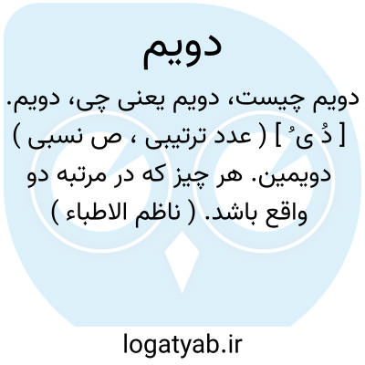 دویم. [ دُ ی ُ ] ( عدد ترتیبی، ص نسبی ) دویمین. هر چیز که در مرتبه دو واقع باشد. ( ناظم الاطباء ) دوم. ثانی. ( یادداشت مؤلف ). به معنی ثانی است و خلاف قاعده است چرا که یاء در اخواتش هیچ جا نیست معهذا در نظم بعضی استادان آمده است ولی صحیح دوم است. ( از آنندراج ) ( از غیاث ). و رجوع به دوم شود. || ( اِ ) وکیل و گماشته. ( ناظم الاطباء ).