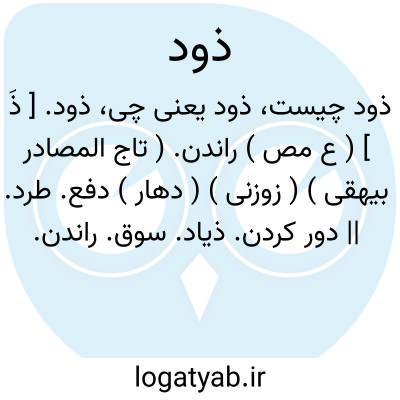 ذود. [ ذَ ] ( ع مص ) راندن. ( تاج المصادر بیهقی ) ( زوزنی ) ( دهار ) دفع. طرد. || دور کردن. ذیاد. سوق. راندن. چنانکه شتران را. || دفاع و حمایت از حسب و اهل و مانند آن.