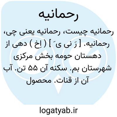 رحمانیه. [ رَ نی ی َ ] ( اِخ ) دهی از دهستان حومه بخش مرکزی شهرستان بم. سکنه آن 55 تن. آب آن از قنات. محصول عمده آن خرما و حنا می باشد. ( از فرهنگ جغرافیایی ایران ج 8 ).