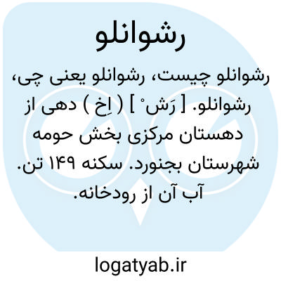 رشوانلو. [ رَش ْ ] ( اِخ ) دهی از دهستان مرکزی بخش حومه شهرستان بجنورد. سکنه 149 تن. آب آن از رودخانه. محصولات عمده غلات و بنشن و انواع میوه. ( از فرهنگ جغرافیایی ایران ج 9 ).
