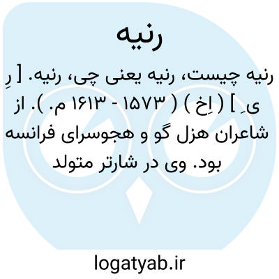 رنیه. [ رِ ی ِ ] ( اِخ ) ( 1573 - 1613 م. ). از شاعران هزل گو و هجوسرای فرانسه بود. وی در شارتر متولد شد و بسن 40سالگی درگذشت. این شاعر در عین آنکه در زمره راهبان بود روزگار خود را با بیقیدی و لاابالیگری بسر برد.