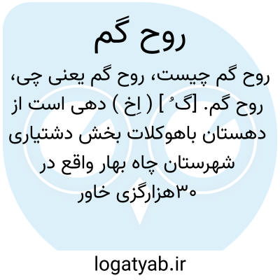 روح گم. [گ ُ ] ( اِخ ) دهی است از دهستان باهوکلات بخش دشتیاری شهرستان چاه بهار واقع در 30هزارگزی خاور دشتیاری و نزدیک مرز پاکستان. در جلگه واقع است و هوای گرم دارد. سکنه آن 80 تن است که مذهب تسنن دارند و به بلوچی سخن میگویند آب آن از چاه تأمین میشود و محصولش لبنیات، ذرت و حبوب، و شغل اهالی زراعت و گله داری است و راه مالرو دارد. ( از فرهنگ جغرافیایی ایران ج 8 ).