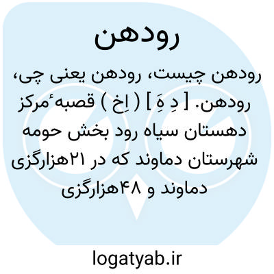 رودهن. [ دِ هَِ ] ( اِخ ) قصبه ٔمرکز دهستان سیاه رود بخش حومه شهرستان دماوند که در 21هزارگزی دماوند و 48هزارگزی تهران، سر سه راه تهران به فیروزکوه و آبعلی واقع است. کوهستانی و سردسیرو دارای 1000 تن سکنه است. آب آن از زهاب رودخانه تأمین میشود و از محصولاتش غلات و لویبا و سیب زمینی و میوه و عسل قابل ذکر است. شغل مردم زراعت و گله داری و قالیچه و جاجیم و جوال بافی است. اداره املاک و باشگاه ژاندارمری و نماینده کشاورزی و نماینده بهداری و بنایی قدیمی بنام امامزاده محمدتقی دارد. مزارع نیمر، کافرچال، آهک چال، چناردره، شجرک، قارپوز، خرابه جزء این ده است. ( از فرهنگ جغرافیایی ایران ج 1 ).